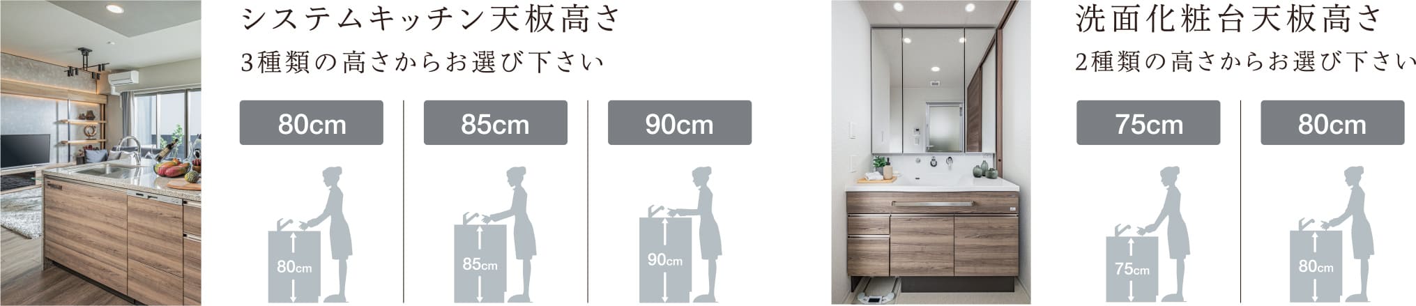 システムキッチンと洗面化粧台の高さがお選びいただけます。